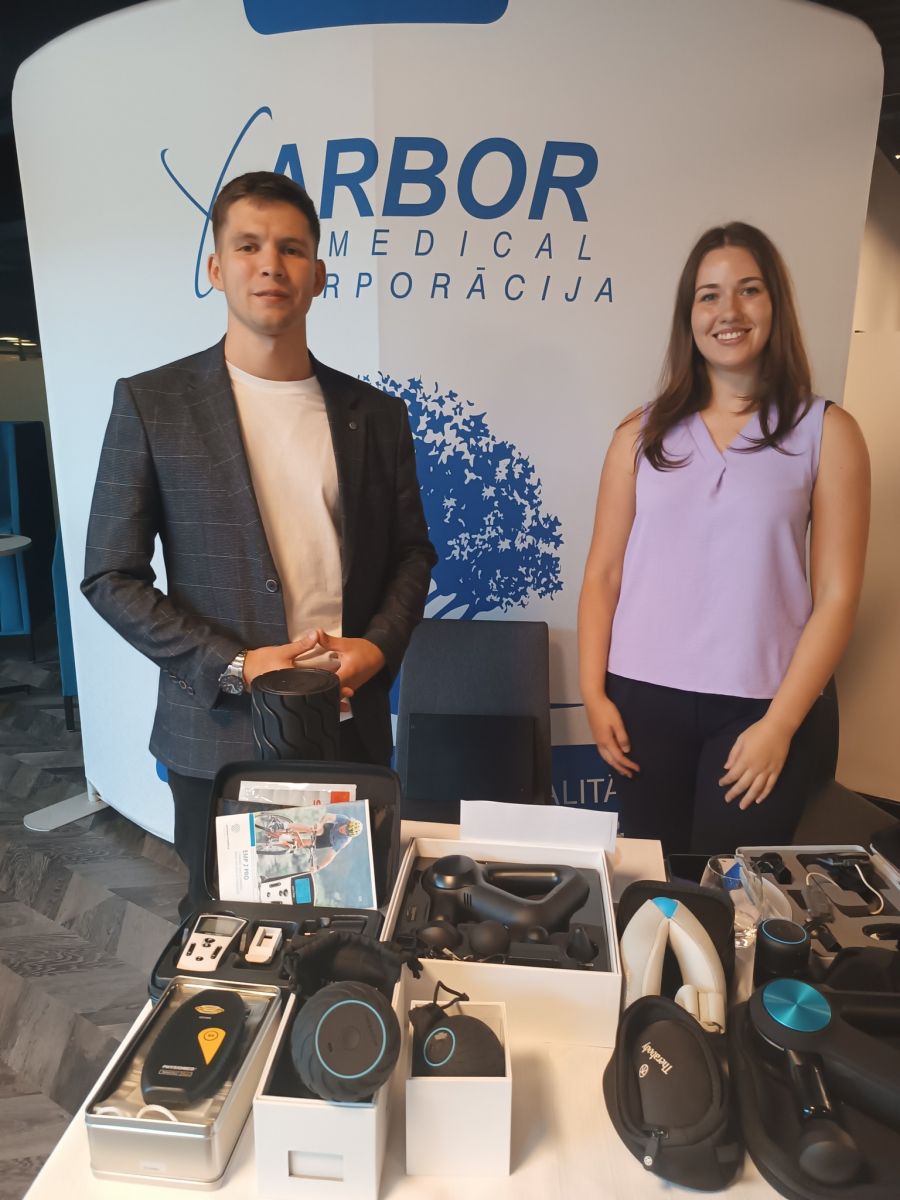 Pasākuma laikā iekārtu varēja aplūkot un iepazīt klātienē mūsu stendā, kur mūsu kolēģi Artjoms Lukjanskis un Annija Rātfeldere iepazīstināja arī ar citām rehabilitācijas un fizioterapijas preces.