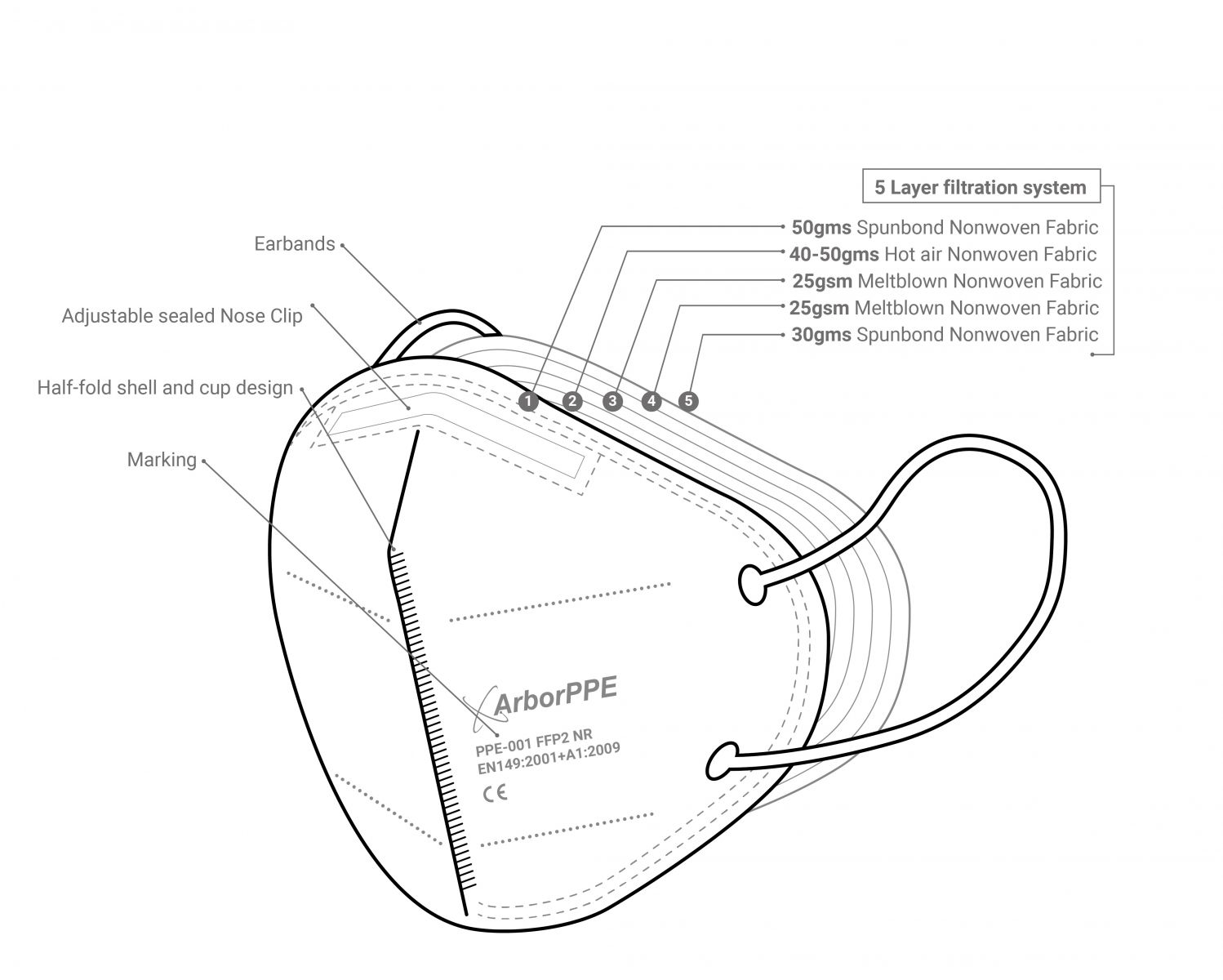 Individuāli iepakotie respiratori sastāv no 5 slāņiem ar zemas pretestības filtrāciju, kas atvieglo elpošanu. Savukārt, tā oriģinālais dizains un ērtās ausu cilpas netraucē sejas kustībai, atbilst sejas formai. Regulējamais deguna stiprinājums mazina brilļu aizsvīšanu saglabājot efektīvu blīvējumu. Ražots pēc EN149:2001+A1:2009.