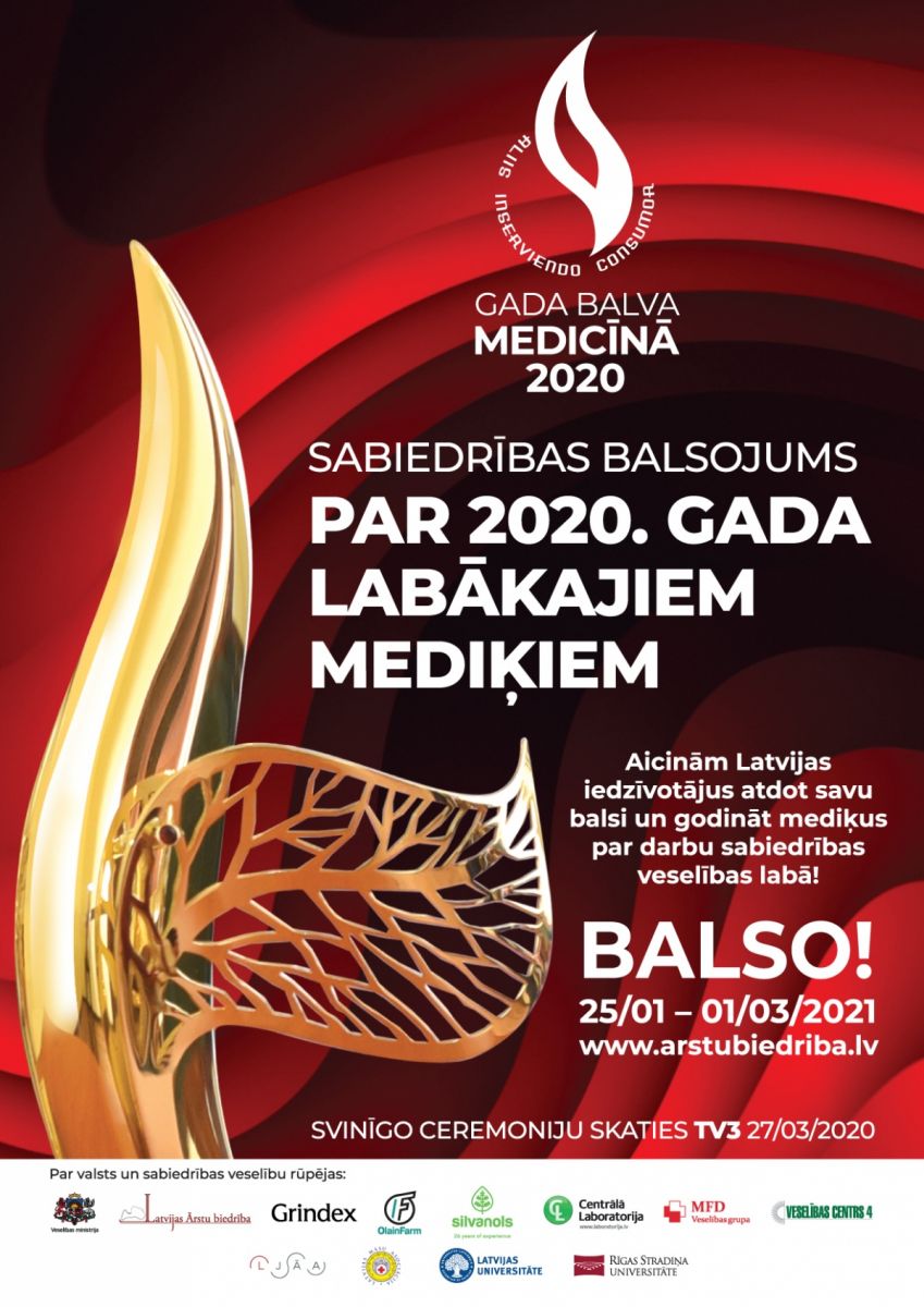 GADA BALVA MEDICĪNĀ 2020 svinīgā ceremonija šogad būs skatāma 27. martā kanālā TV3. Šogad “Gada balva medicīnā” tiks pasniegta 14 nominācijās, par deviņām no tām līdz šā gada 1. martam notiek sabiedrības balsojums sadaļā “Balsošana”.