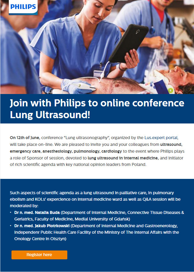 On 12th of June, conference "Lung ultrasonography", organized by the Lus.expert portal, will take place on-line. We are pleased to invite you and your colleagues from ultrasound, emergency care, anesthesiology, pulmonology, cardiology to the event where Philips plays a role of Sponsor of session, devoted to lung ultrasound in internal medicine, and initiator of rich scientific agenda with key national opinion leaders from Poland.