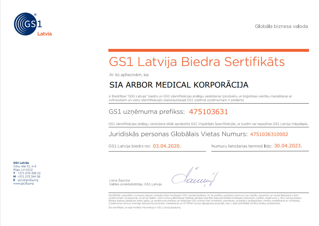 SIA "Arbor Medical Korporācija" atjaunojusi "GS1 Latvija" sertifikātu, kas dod tiesības identifikācijas atslēgu veidošanai(produktu un loģistikas vienību marķēšanai ar svītrukodiem un vietu identifikācijai). Uzņēmumam piešķirts GS1 uzņēmumu prefikss: 475103631. Juridiskās personas globālais vietu numurs: 4751036310002. Derīguma termiņš: 30.04.2023.