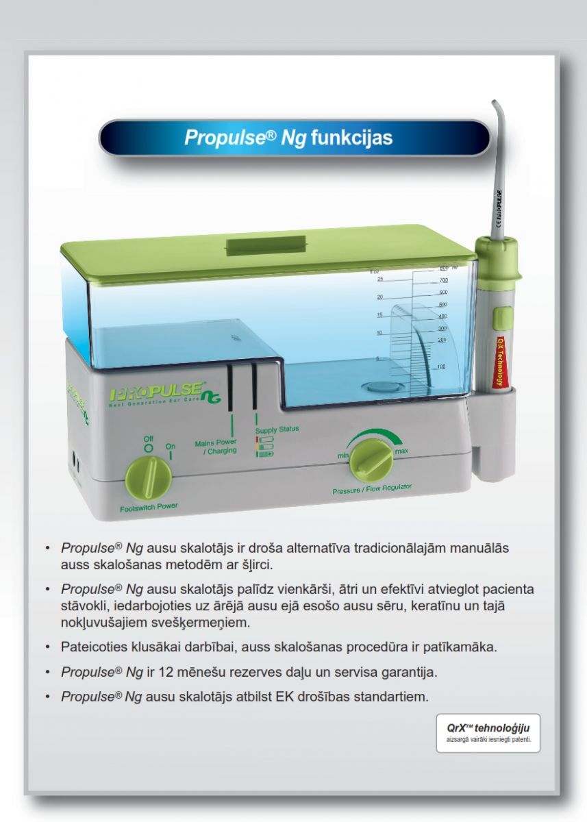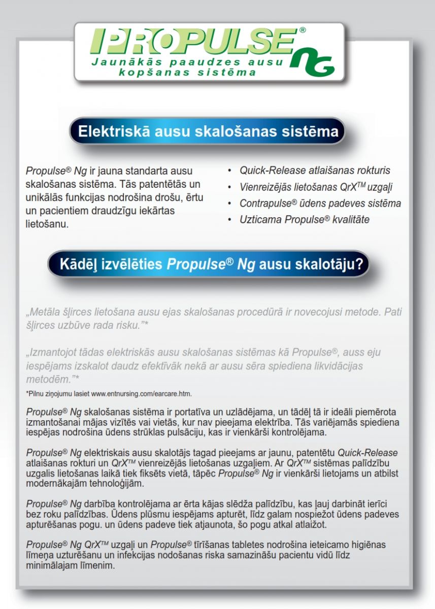 „Propulse NG” elektroniskā ausu skalošanas sistēma ir paredzēta: