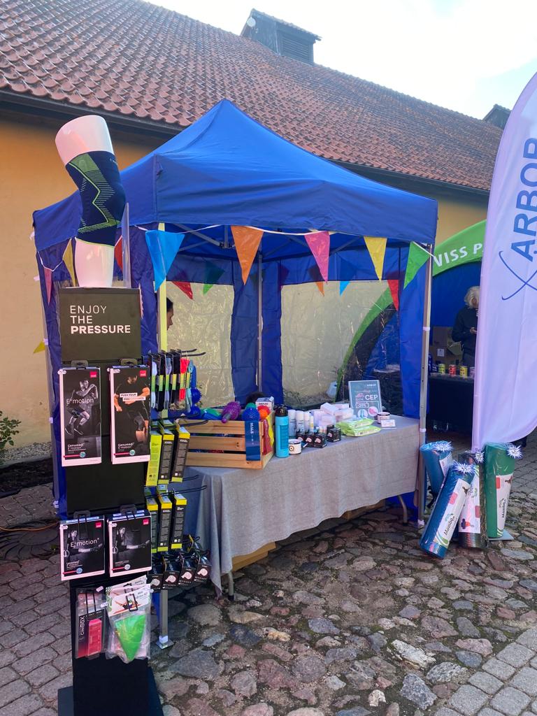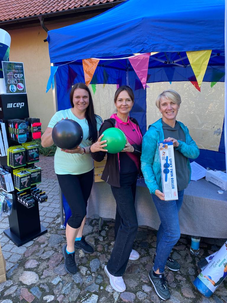 Arbor Medical Korporācija SIA stendā kolēģes Sanita Bērziņa, Aiva Mičule un Linda Kivleniece rādīja, stāstīja un piedāvāja iegādāties dažādas dalībniekiem un līdzjutējiem noderīgas preces, piemēram, kvalitatīvās sporta kompresijas zeķes CEP, ortozes, masāžas bumbas, vingrošanas paklājiņus, līdzekļus sāpju un sastiepumu remdēšanai u.c.