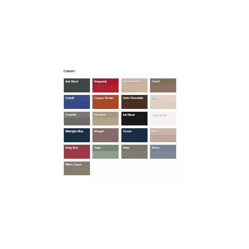 Pieejams plašs polsterējuma krāsu klāsts – no klasiskām (Graphite, Stone, Ecru) līdz izteiksmīgām (Ruby Red, Ink Black, Midnight Blue).
