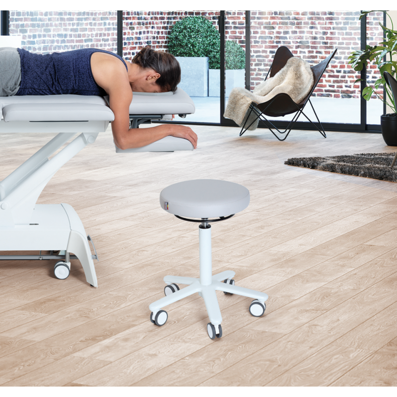 Gymna Stool – universāls apaļš taburete ar 35 cm diametru un 360° regulācijas sviru. Stabils alumīnija 5 zvaigžņu pamatnes dizains, pašbloķējoši ritenīši un plaša krāsu izvēle nodrošina komfortu un drošību gan speciālistam, gan pacientam.