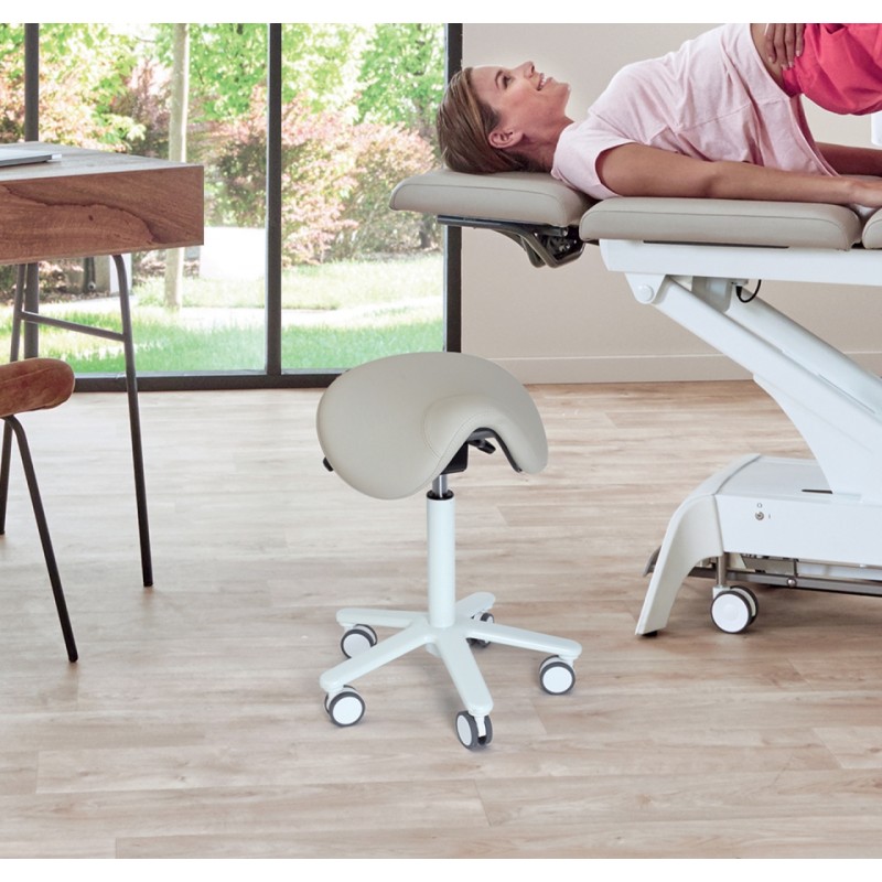 Gymna Saddle Stool ir ideāls ergonomisks risinājums veselības aprūpes profesionāļiem. Seglu formas sēde nodrošina atvērtāku gūžas leņķi, kas palīdz iegurnim noliekties uz priekšu, tādējādi mugurkauls saglabā dabisku S-formu. Šī pozīcija mazina muguras saspringumu ilgstošas sēdēšanas laikā un veicina aktīvāku, veselīgāku sēdēšanas ieradumu.