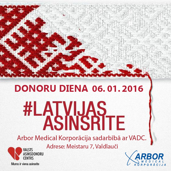 Iesāc 2016.gadu ar labu darbu un pievienojies Arbor Medical Korporācijai un Valsts Asinsdonoru centram ziedojot asinis Donoru dienā 06.janvārī Arbor Medical Korporācija telpās, Meistaru ielā 7, Valdlaučos no 10.00 līdz 14.00.